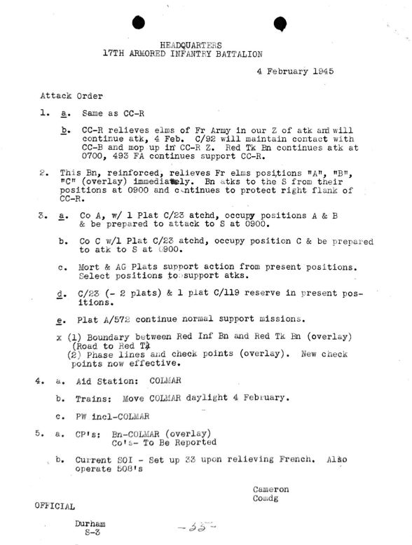 “Attack Order.” Headquarters 17th Armored Infantry Battalion, February 4, 1945. World War II Operations Reports, 1940–48. Record Group 407, Records of the Adjutant General’s Office. National Archives at College Park, Maryland.