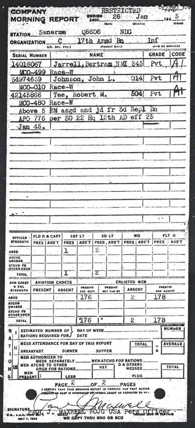 According to the statement, Tee soon moved to England and then France, where he was assigned to Company “C,” 17th Armored Infantry Battalion, 12th Armored Division. A company morning report stated that Private Tee was one of five replacements who was assigned to and joined the unit in the Alsace region of France, transferring in from the 3rd Replacement Battalion on January 25, 1945.