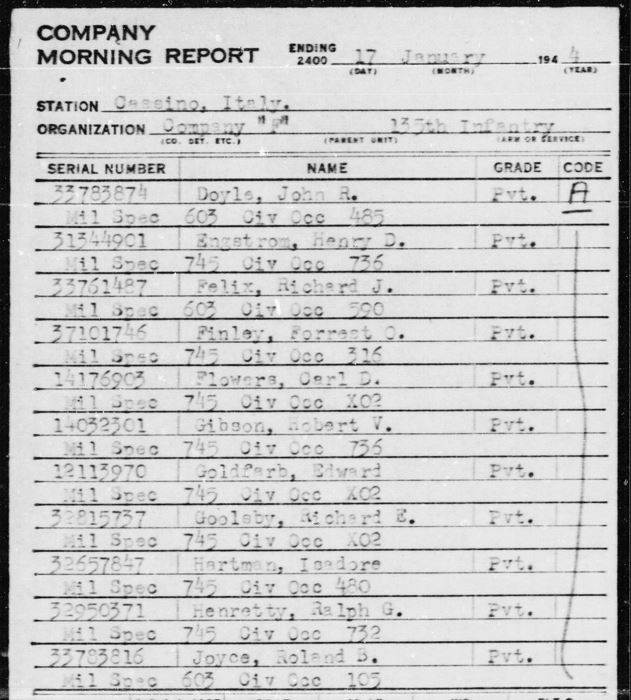 Morning Reports for Company “F,” 135th Infantry Regiment. January 1944 – February 1944. U.S. Army Morning Reports, c. 1912–1946. Record Group 64, Records of the National Archives and Records Administration. National Archives at St. Louis, Missouri. https://s3.amazonaws.com/NARAprodstorage/lz/partners/st-louis/rg-064/85713825-wwii/85713825_1944-01/85713825_1944-01_Roll-0515/85713825_1944-01_Roll-0515-27.pdf, https://s3.amazonaws.com/NARAprodstorage/lz/partners/st-louis/rg-064/85713825-wwii/85713825_1944-02/85713825_1944-02_Roll-0450/85713825_1944-02_Roll-0450-07.pdf