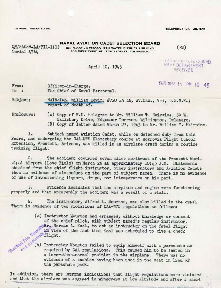 Aviation Cadet Hairsine went on active duty on February 8, 1943, at the Naval Aviation Cadet Selection Board, Philadelphia, Pennsylvania. That same day, he was dispatched along with 39 other aviation cadets to Prescott, Arizona, “on detached duty from Naval Aviation Cadet Selection Board, Los Angeles California, for purpose of undergoing CAAWTS [Civil Aeronautics Authority War Training Service], Elementary Training Program[.]”
