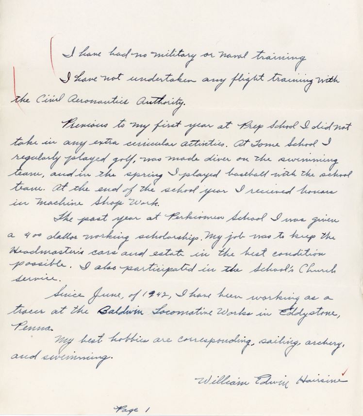 In a recommendation letter dated September 11, 1942, Perkiomen’s headmaster, Clarence Edwin Tobias, Jr. (1903–1984), wrote that Hairsine “is a boy of fine personality, unusual mechanical aptitude, and excellent citizenship. He is trustworthy, conscientious, and an all-around fine boy.”