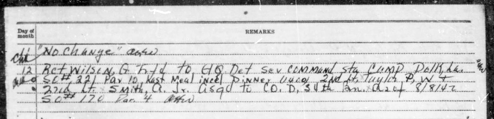 On August 8, 1942, 2nd Lieutenant Taylor was assigned to Company “D,” 34th Battalion, Engineer Replacement Training Center, Fort Leonard Wood, Missouri, as a company officer. Some bureaucratic shuffling followed. 2nd Lieutenant Taylor was released from the assignment but attached to Company “D” on August 20, 1942. This status change was reversed on September 3, 1942, when he was released from attachment and became a full member of Company “D” again.
