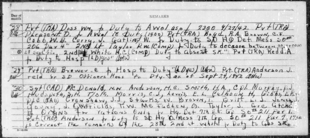 Morning Reports for Company “D,” 34th Engineer Training Battalion. August 1942 – September 1942. U.S. Army Morning Reports, c. 1912–1946. Record Group 64, Records of the National Archives and Records Administration. National Archives at St. Louis, Missouri. https://s3.amazonaws.com/NARAprodstorage/lz/partners/st-louis/rg-064/85713825-wwii/85713825_1940-01-thru-1943-07/85713825_1940-01-thru-1943-07_Roll-1157/85713825_1940-01-thru-1943-07_Roll-1157-36.pdf