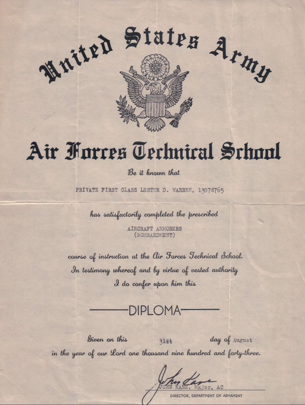 On the afternoon of July 18, 1943, Private 1st Class Warren was attached unassigned to the 21st Technical School Squadron, 38th Technical School Group at Lowry Field, Colorado, to take the Aircraft Armorers (Bombardment) class. Upon graduation on August 31, 1943, he was promoted to sergeant and his military occupational specialty code (M.O.S.) changed to 612, airplane gunner-armorer. That same day, he was transferred to the 18th Replacement Wing at the Army Air Base, Salt Lake City, Utah. On September 10, 1943, he was attached to the 39th Bombardment Group (Heavy) at Davis-Monthan Field, Arizona. On September 17, 1943, Sergeant Warren was further attached to the 402nd Bombardment Squadron (Heavy), a training squadron equipped with the Consolidated B-24 Liberator.