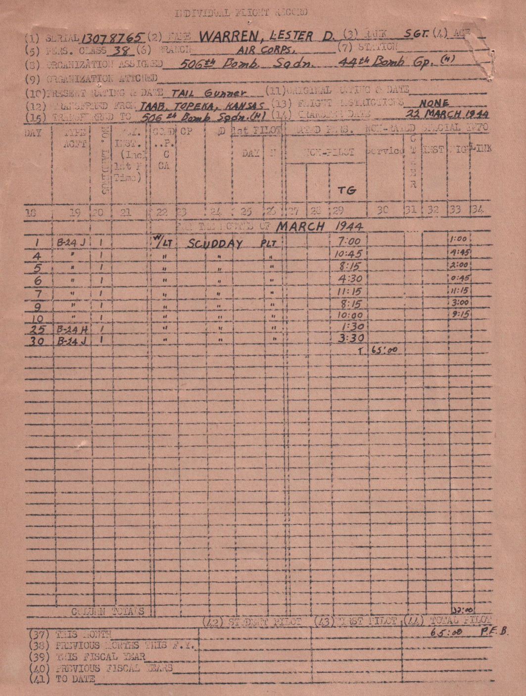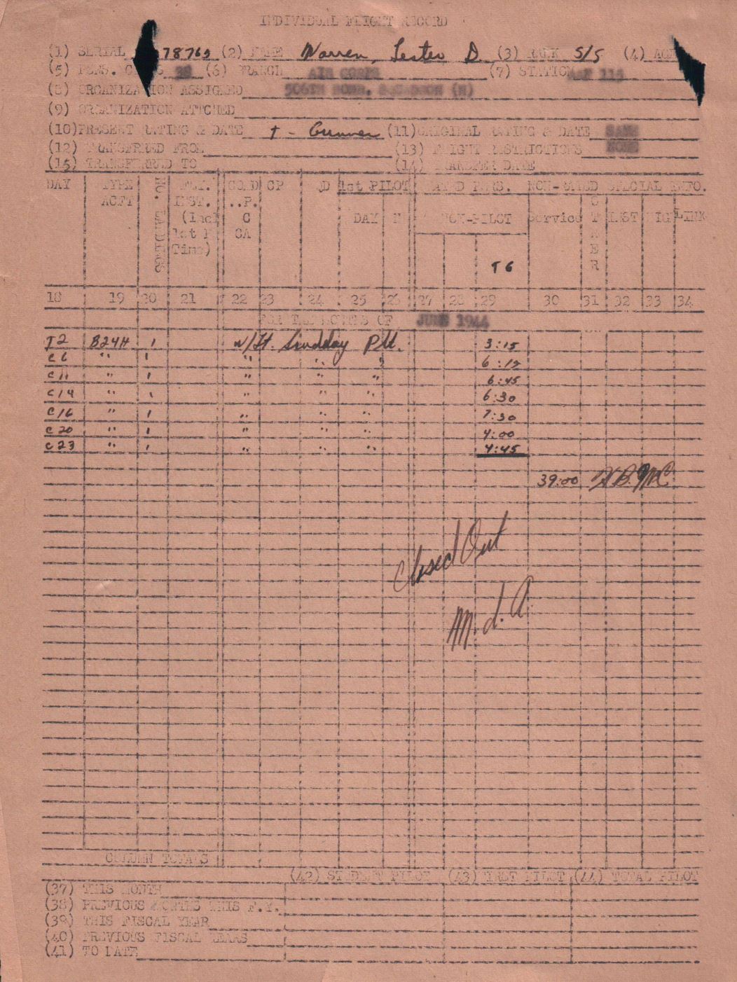 According to his personnel flight record, prior to entering combat, Warren went on three training flights in England, totaling nine hours and 15 minutes.