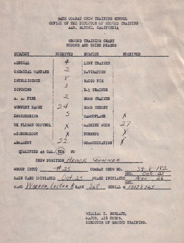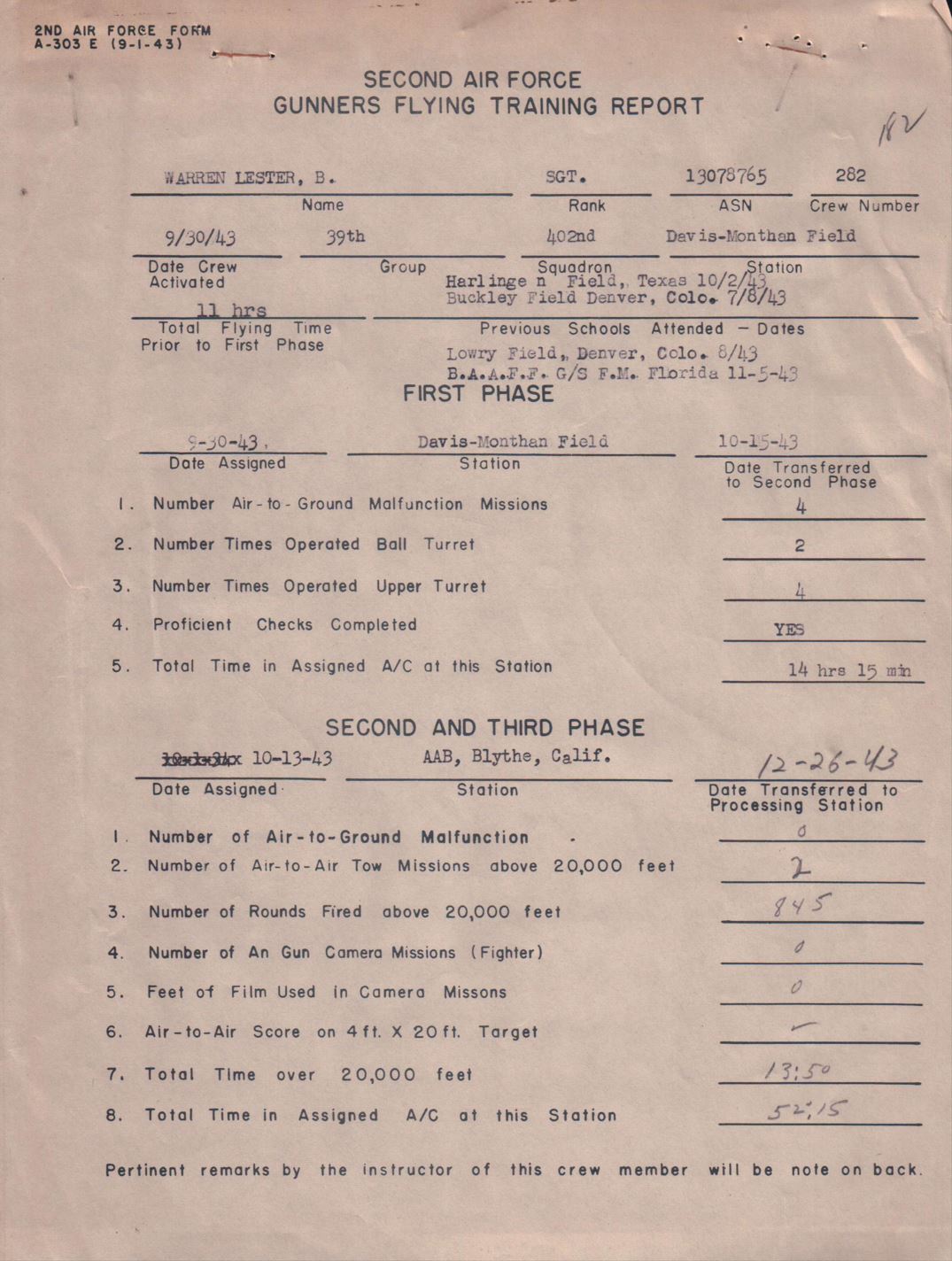 It is unclear how far Warren progressed in pilot training. His mother’s statement did not mention any training schools between his arrival in Nashville and when he reported for flexible gunnery school about six months later. Presumably, he was dropped from pilot training during the preflight or primary phases, since a document reported that prior to beginning crew training on September 30, 1943, he had 11 hours of flying time. That figure should have included both flight time accumulated during pilot training and later flexible gunnery training. It is unclear if Warren did any training to become a bombardier or navigator during early 1943.