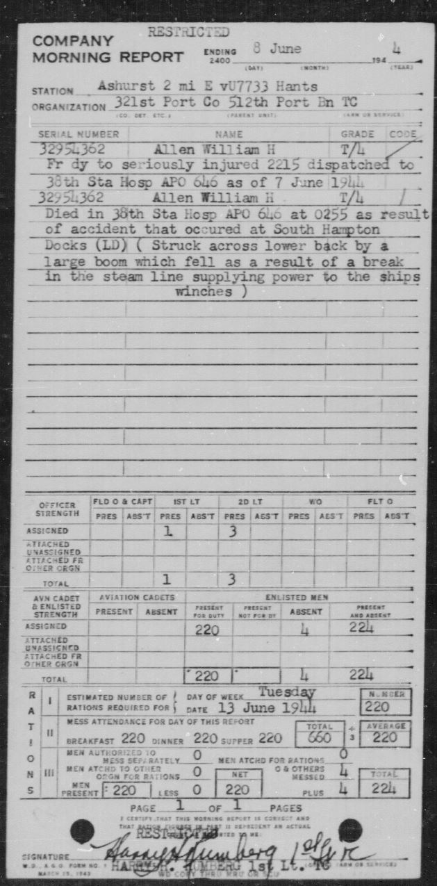 At 2215 hours on June 7, 1944, the night after D-Day in Normandy, Technician 4th Grade Allen was severely injured in an accident in the line of duty while working aboard a ship at Southampton, suffering a compound fracture to his pelvis. A morning report stated that he was “Struck across lower back by a large boom which fell as a result of a break in the steam line supplying power to the ship[’]s winches[.]”