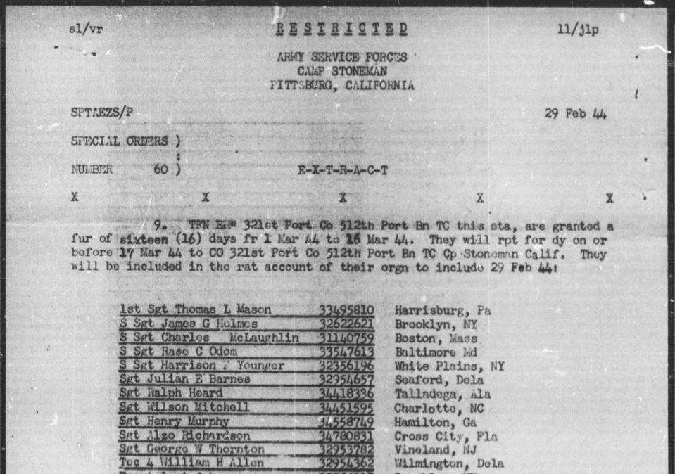 Morning Reports for 321st Port Company, 512th Port Battalion. August 1943 – May 1944. U.S. Army Morning Reports, c. 1912–1946. Record Group 64, Records of the National Archives and Records Administration. National Archives at St. Louis, Missouri. https://s3.amazonaws.com/NARAprodstorage/lz/partners/st-louis/rg-064/85713825-wwii/85713825_1943-08/85713825_1943-08_Roll-0200/85713825_1943-08_Roll-0200-32.pdf, https://s3.amazonaws.com/NARAprodstorage/lz/partners/st-louis/rg-064/85713825-wwii/85713825_1943-09/85713825_1943-09_Roll-0002/85713825_1943-09_Roll-0002-20.pdf, https://s3.amazonaws.com/NARAprodstorage/lz/partners/st-louis/rg-064/85713825-wwii/85713825_1943-09/85713825_1943-09_Roll-0002/85713825_1943-09_Roll-0002-21.pdf, https://s3.amazonaws.com/NARAprodstorage/lz/partners/st-louis/rg-064/85713825-wwii/85713825_1943-10/85713825_1943-10_Roll-0322/85713825_1943-10_Roll-0322-27.pdf, https://s3.amazonaws.com/NARAprodstorage/lz/partners/st-louis/rg-064/85713825-wwii/85713825_1943-11/85713825_1943-11_Roll-0236/85713825_1943-11_Roll-0236-04.pdf, https://s3.amazonaws.com/NARAprodstorage/lz/partners/st-louis/rg-064/85713825-wwii/85713825_1943-11/85713825_1943-11_Roll-0247/85713825_1943-11_Roll-0247-04.pdf, https://s3.amazonaws.com/NARAprodstorage/lz/partners/st-louis/rg-064/85713825-wwii/85713825_1943-12/85713825_1943-12_Roll-0474/85713825_1943-12_Roll-0474-03.pdf, https://s3.amazonaws.com/NARAprodstorage/lz/partners/st-louis/rg-064/85713825-wwii/85713825_1944-01/85713825_1944-01_Roll-0322/85713825_1944-01_Roll-0322-18.pdf, https://s3.amazonaws.com/NARAprodstorage/lz/partners/st-louis/rg-064/85713825-wwii/85713825_1944-02/85713825_1944-02_Roll-0348/85713825_1944-02_Roll-0348-04.pdf, https://s3.amazonaws.com/NARAprodstorage/lz/partners/st-louis/rg-064/85713825-wwii/85713825_1944-03/85713825_1944-03_Roll-0177/85713825_1944-03_Roll-0177-03.pdf, https://s3.amazonaws.com/NARAprodstorage/lz/partners/st-louis/rg-064/85713825-wwii/85713825_1944-03/85713825_1944-03_Roll-0343/85713825_1944-03_Roll-0343-16.pdf, https://s3.amazonaws.com/NARAprodstorage/lz/partners/st-louis/rg-064/85713825-wwii/85713825_1944-04/85713825_1944-04_Roll-0241/85713825_1944-04_Roll-0241-23.pdf, https://s3.amazonaws.com/NARAprodstorage/lz/partners/st-louis/rg-064/85713825-wwii/85713825_1944-04/85713825_1944-04_Roll-0714/85713825_1944-04_Roll-0714-04.pdf, https://s3.amazonaws.com/NARAprodstorage/lz/partners/st-louis/rg-064/85713825-wwii/85713825_1944-05/85713825_1944-05_Roll-0647/85713825_1944-05_Roll-0647-07.pdf, https://s3.amazonaws.com/NARAprodstorage/lz/partners/st-louis/rg-064/85713825-wwii/85713825_1944-06/85713825_1944-06_Roll-0422/85713825_1944-06_Roll-0422-18.pdf