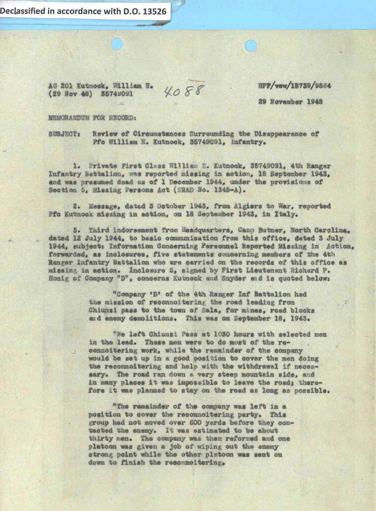A third account of the events of September 18–19, 1943, a statement by 1st Lieutenant Richard P. Honig (1920–1979) written in July 1944, was quoted in Private 1st Class Kutnock’s individual deceased personnel file (I.D.P.F.):