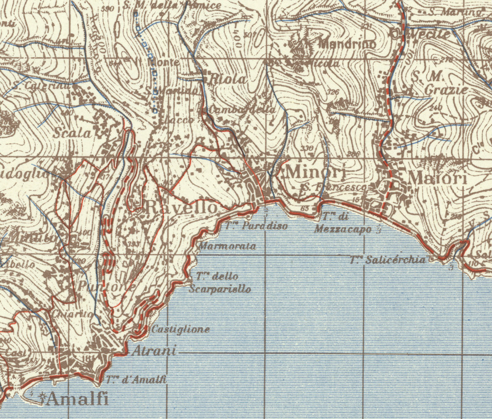 Honig’s statement implies that Maloney and the others were killed during a firefight with a roadblock west of Hill 540. The exact location of the roadblock is unclear beyond that it was in area so steep that flanking the position by going offroad was impossible. Much of the area has a drop off on one side of the road and steep mountainside on the other. If both sides had a drop off like Honig recalled, a likely location for the roadblock is on the map near the “t” in in “marante,” northwest of Hill 540 and north of Pigno. (McMaster University Library)