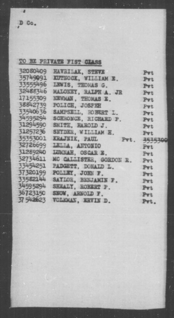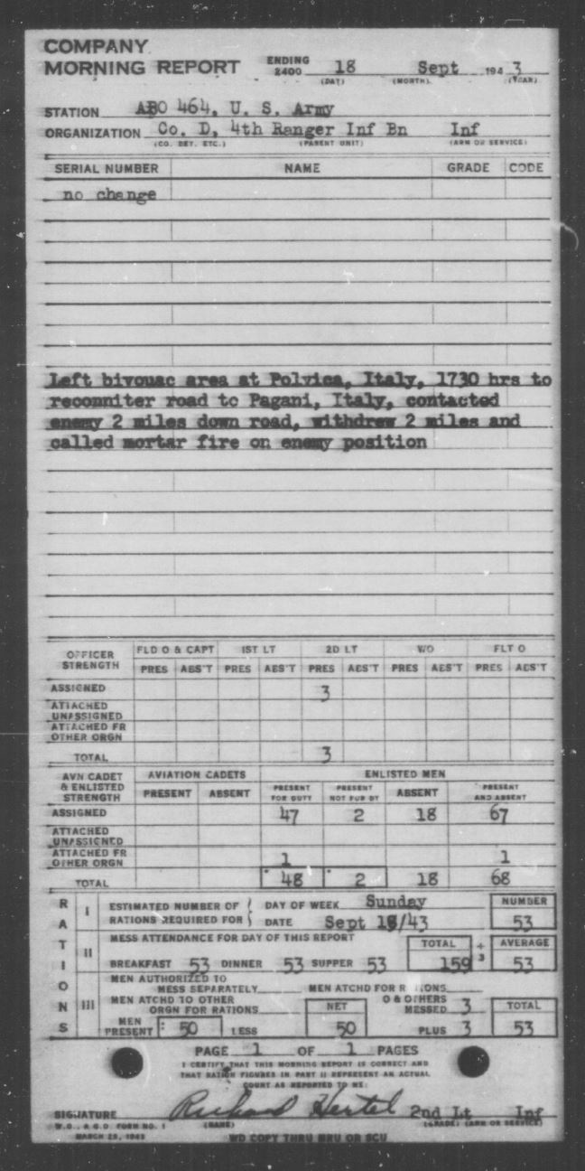 Morning Reports for Company “D,” 4th Ranger Infantry Battalion. August 1943 – September 1943. U.S. Army Morning Reports, c. 1912–1946. Record Group 64, Records of the National Archives and Records Administration. National Archives at St. Louis, Missouri. https://s3.amazonaws.com/NARAprodstorage/lz/partners/st-louis/rg-064/85713825-wwii/85713825_1943-08/85713825_1943-08_Roll-0468/85713825_1943-08_Roll-0468-22.pdf, https://s3.amazonaws.com/NARAprodstorage/lz/partners/st-louis/rg-064/85713825-wwii/85713825_1943-09/85713825_1943-09_Roll-0562/85713825_1943-09_Roll-0562-16.pdf, https://s3.amazonaws.com/NARAprodstorage/lz/partners/st-louis/rg-064/85713825-wwii/85713825_1943-09/85713825_1943-09_Roll-0562/85713825_1943-09_Roll-0562-17.pdf
