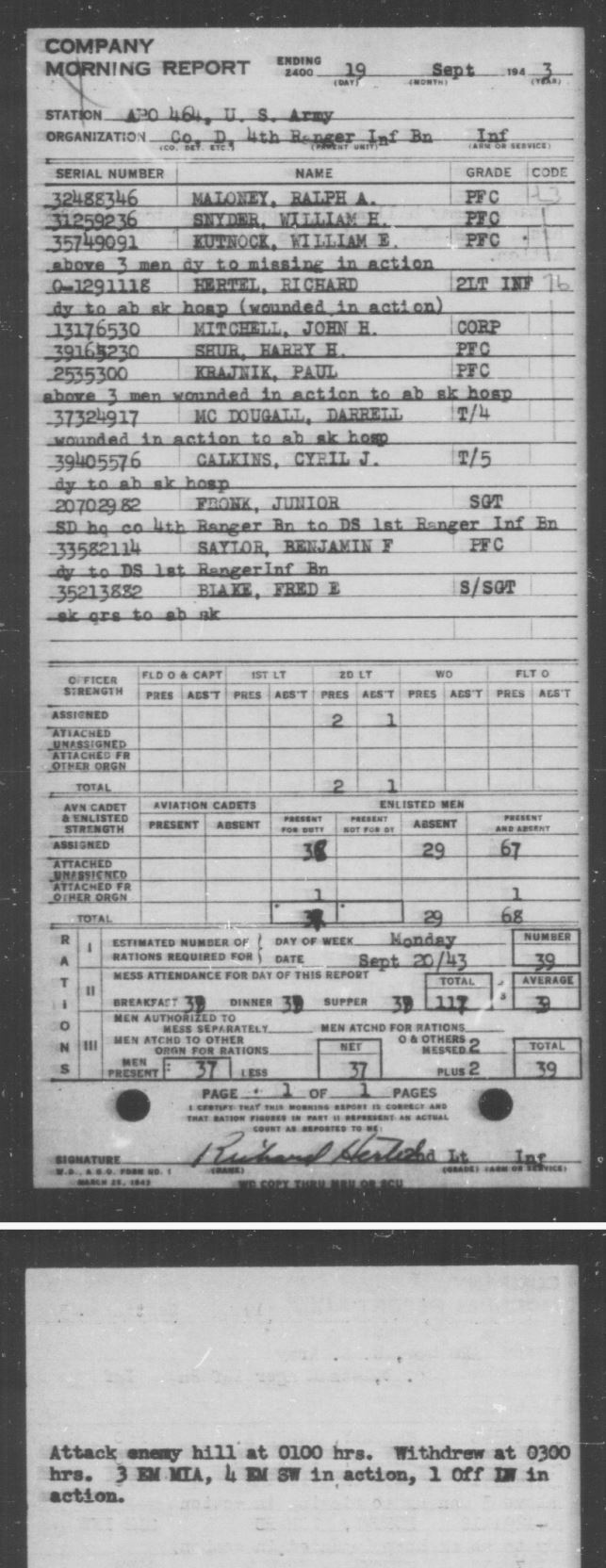 According to the next morning report, dated September 19, 1943, Company “D” attacked an enemy hilltop position that night, beginning at 0100 hours. After two hours of fighting, the Rangers retreated. This morning report recorded casualties of three men missing in action (M.I.A.), including Private 1st Class Maloney, and five men wounded.