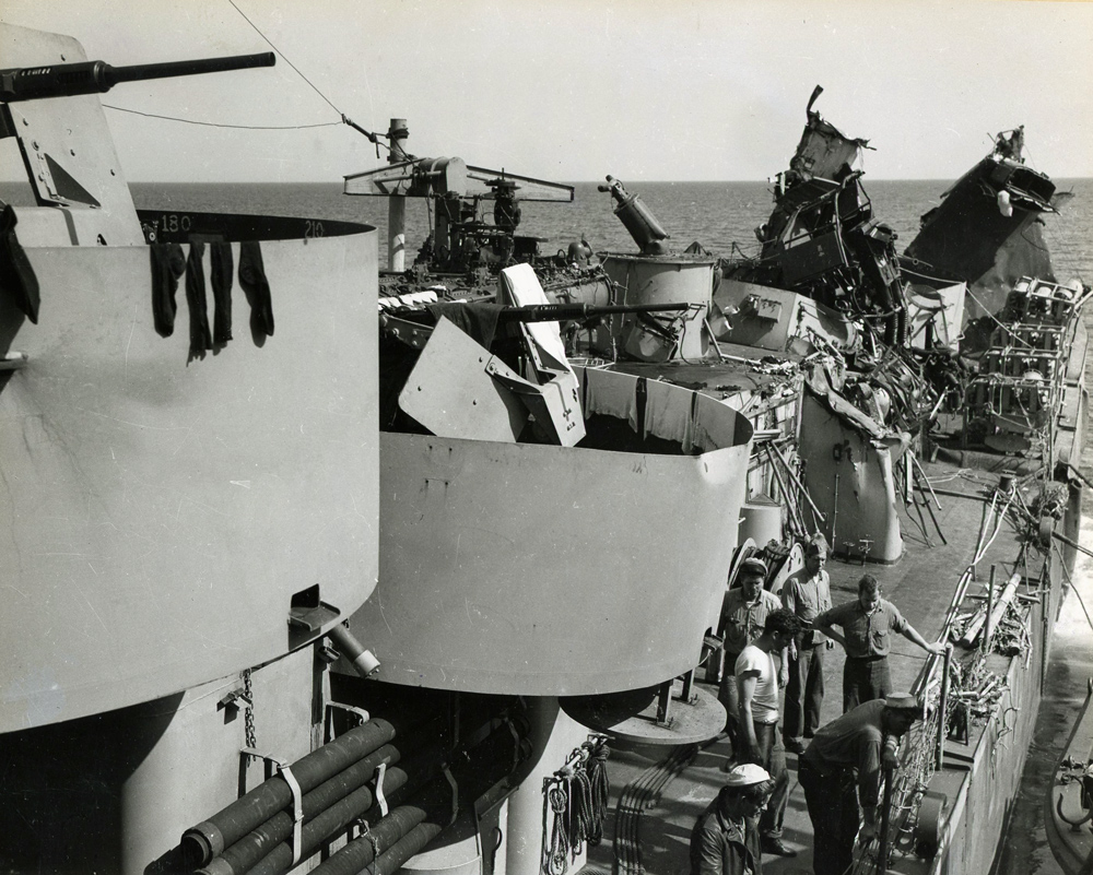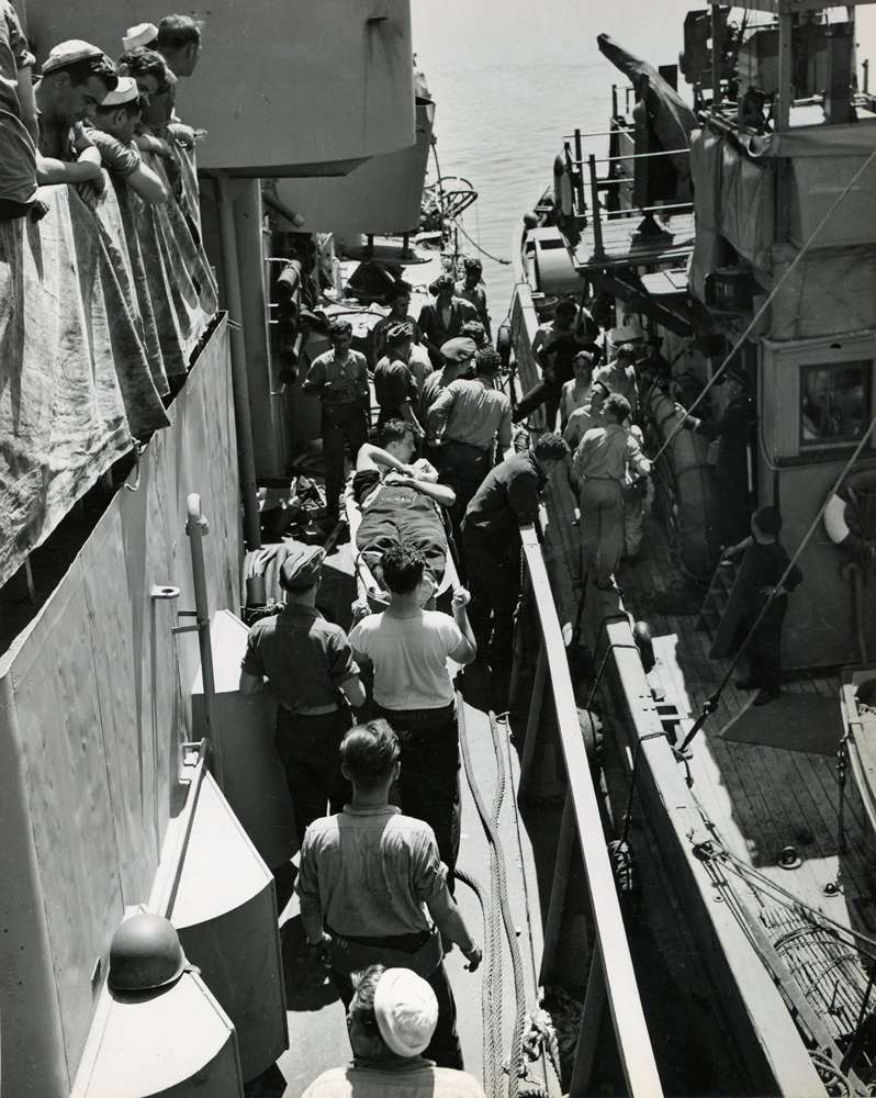 The crew rushed to repair the damage and treat the wounded. Hours before the attack, Menges’s doctor had been transferred to a merchant ship to treat an injured patient, so Chief Pharmacist’s Mate Harold Levy (1913–2003), who was later awarded the Legion of Merit, treated 25 wounded men virtually singlehandedly until a British doctor was dropped off from the destroyer H.M.S. Blankney the following morning. The British tug H.M.S. Aspirant towed Menges into Bougie, Algeria, where the dead and wounded were offloaded before the ship was towed to Algiers.