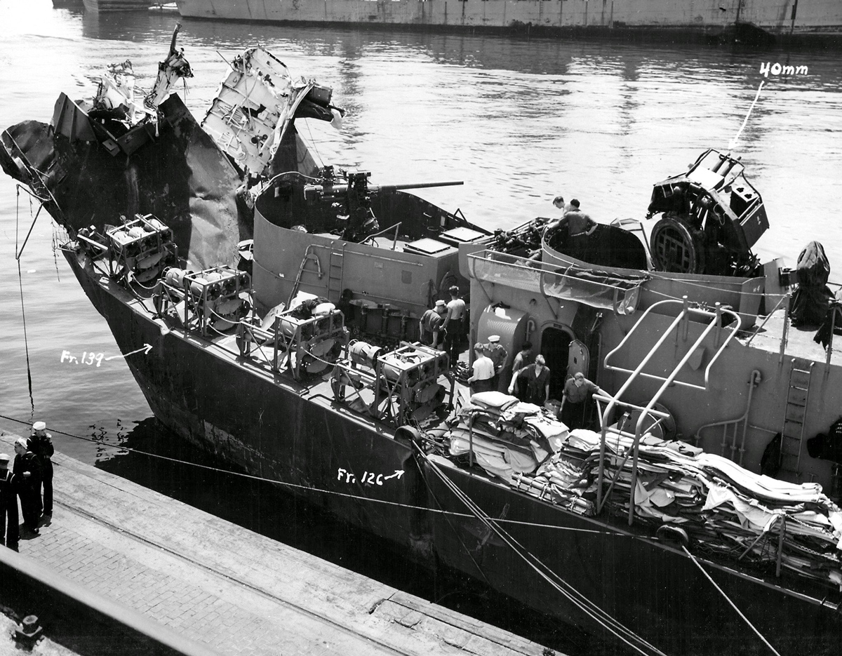 The crew rushed to repair the damage and treat the wounded. Hours before the attack, Menges’s doctor had been transferred to a merchant ship to treat an injured patient, so Chief Pharmacist’s Mate Harold Levy (1913–2003), who was later awarded the Legion of Merit, treated 25 wounded men virtually singlehandedly until a British doctor was dropped off from the destroyer H.M.S. Blankney the following morning. The British tug H.M.S. Aspirant towed Menges into Bougie, Algeria, where the dead and wounded were offloaded before the ship was towed to Algiers.