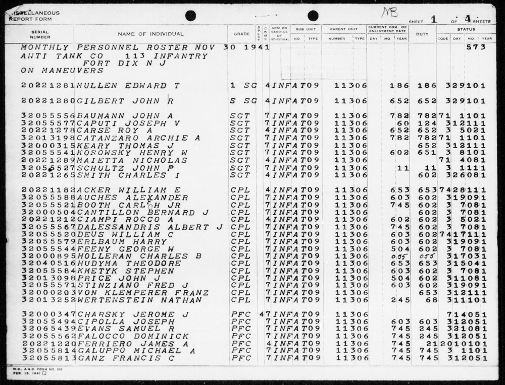 “Monthly Personnel Roster Nov 30 1941 Anti Tank Co 113 Infantry.” November 30, 1941. U.S. Army Muster Rolls and Rosters, November 1, 1912 – December 31, 1943. Record Group 64, Records of the National Archives and Records Administration. National Archives at St. Louis, Missouri. https://s3.amazonaws.com/NARAprodstorage/lz/st-louis/rg-064/85713803_1940-1943/85713803_1940-1943_Roll-1659/85713803_1940-1943_Roll-1659_11.pdf