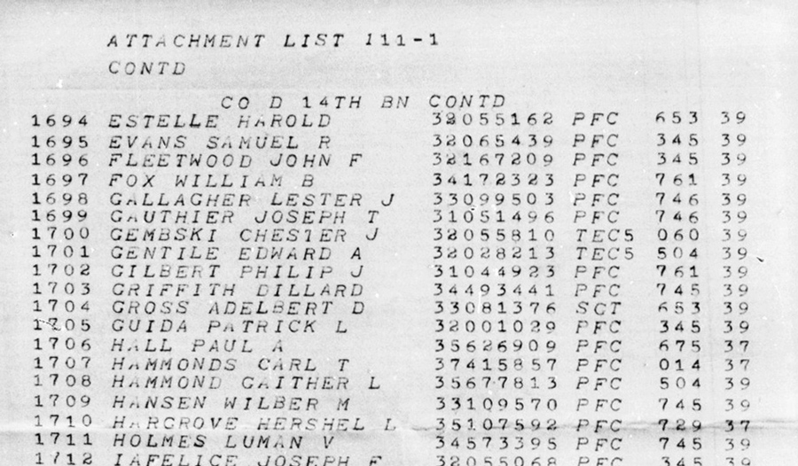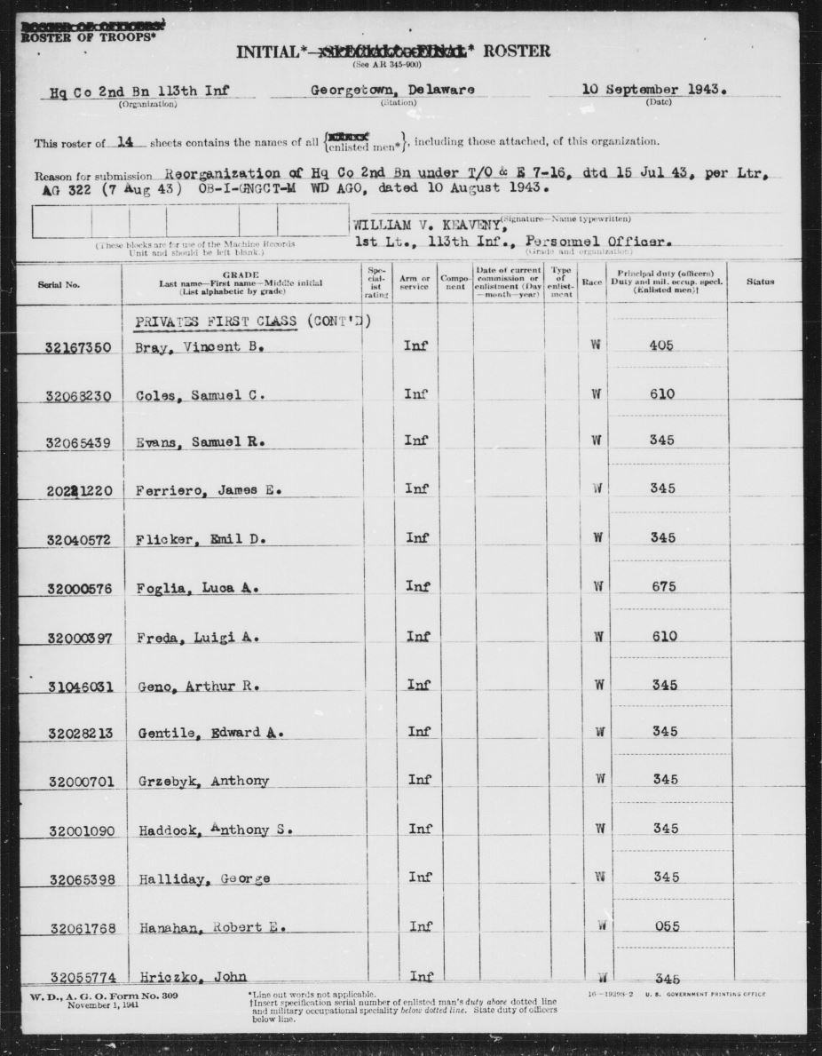 “Initial Roster Hq Co 2nd Bn 113th Inf.” September 10, 1943. U.S. Army Muster Rolls and Rosters, November 1, 1912 – December 31, 1943. Record Group 64, Records of the National Archives and Records Administration. National Archives at St. Louis, Missouri. https://s3.amazonaws.com/NARAprodstorage/lz/st-louis/rg-064/85713803_1940-1943/85713803_1940-1943_Roll-1660/85713803_1940-1943_Roll-1660_02.pdf