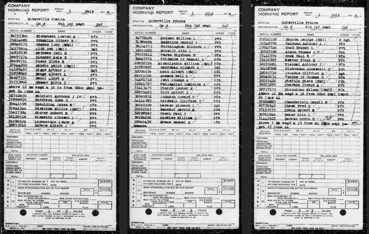 Morning Reports for Company “F,” 8th Infantry Regiment. July 1944. U.S. Army Morning Reports, c. 1912–1946. Record Group 64, Records of the National Archives and Records Administration. National Archives at St. Louis, Missouri. https://s3.amazonaws.com/NARAprodstorage/lz/partners/st-louis/rg-064/85713825-wwii/85713825_1944-07/85713825_1944-07_Roll-0774/85713825_1944-07_Roll-0774-14.pdf