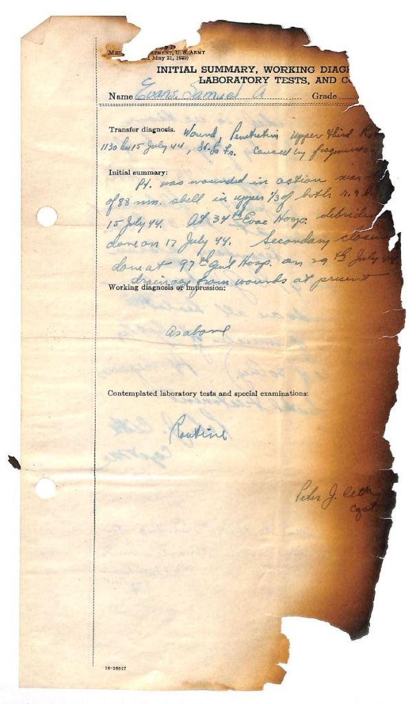 Miraculously, a portion of Evans’s personnel file survived the 1973 National Personnel Records Center fire which destroyed the vast majority of U.S. Army personnel records from the World War II era. The remaining portion of his file, which was severely charred in the fire, pertains mostly to his military medical records.
