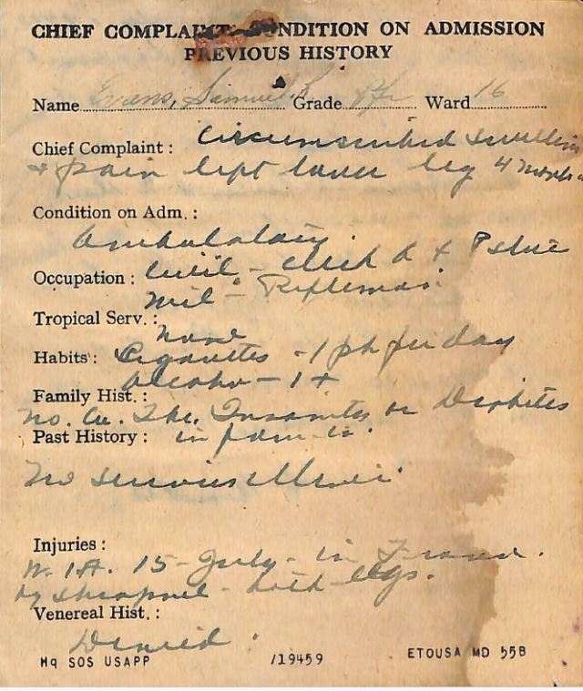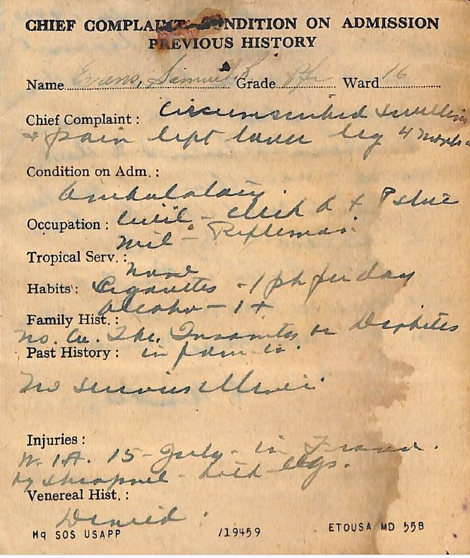 Those orders came down a few hours too late to prevent Evans from being seriously wounded in action. According to his medical records, at around 1130 hours on July 15, 1944, Evans was struck in both legs by fragments of a high explosive 88 mm shell. One document stated he was hit in “both calves & upper L. leg.” Another document stated he was hit in the upper third of both thighs.