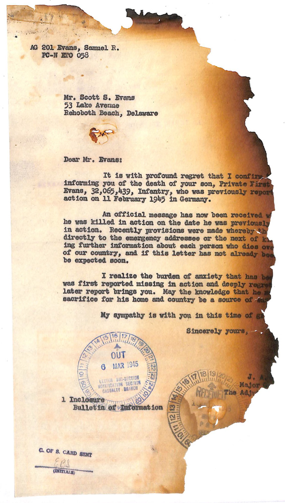 The Wilmington Morning News reported that Scott Evans was notified on February 28, 1945, that his son was missing in action, and received confirmation of his death on March 4. After the war, in 1948, Scott Evans requested that Private 1st Class Evans’s body be repatriated to the United States. His casket returned to the New York Port of Embarkation from Antwerp, Belgium, aboard the Liberty ship Barney Kirschbaum. On the night of April 25, 1949, Evans’s casket left New York by train, accompanied by a military escort, Corporal John J. Kelly. After arriving at Lewes, Delaware, the following morning, Corporal Kelly turned the body over to the undertaker.