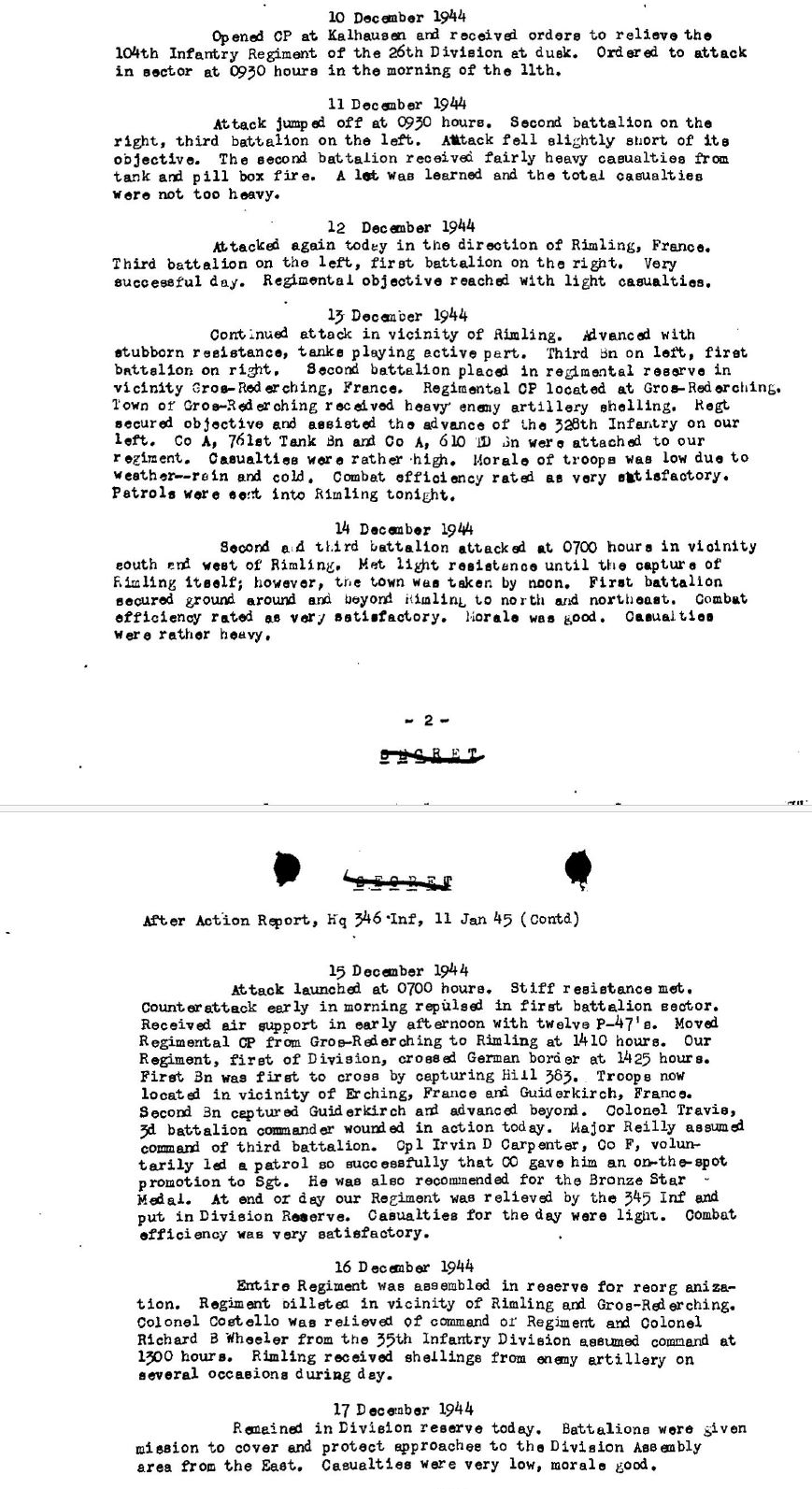 At 0700 hours the following day, December 15, 1944, the 346th Infantry advanced again: