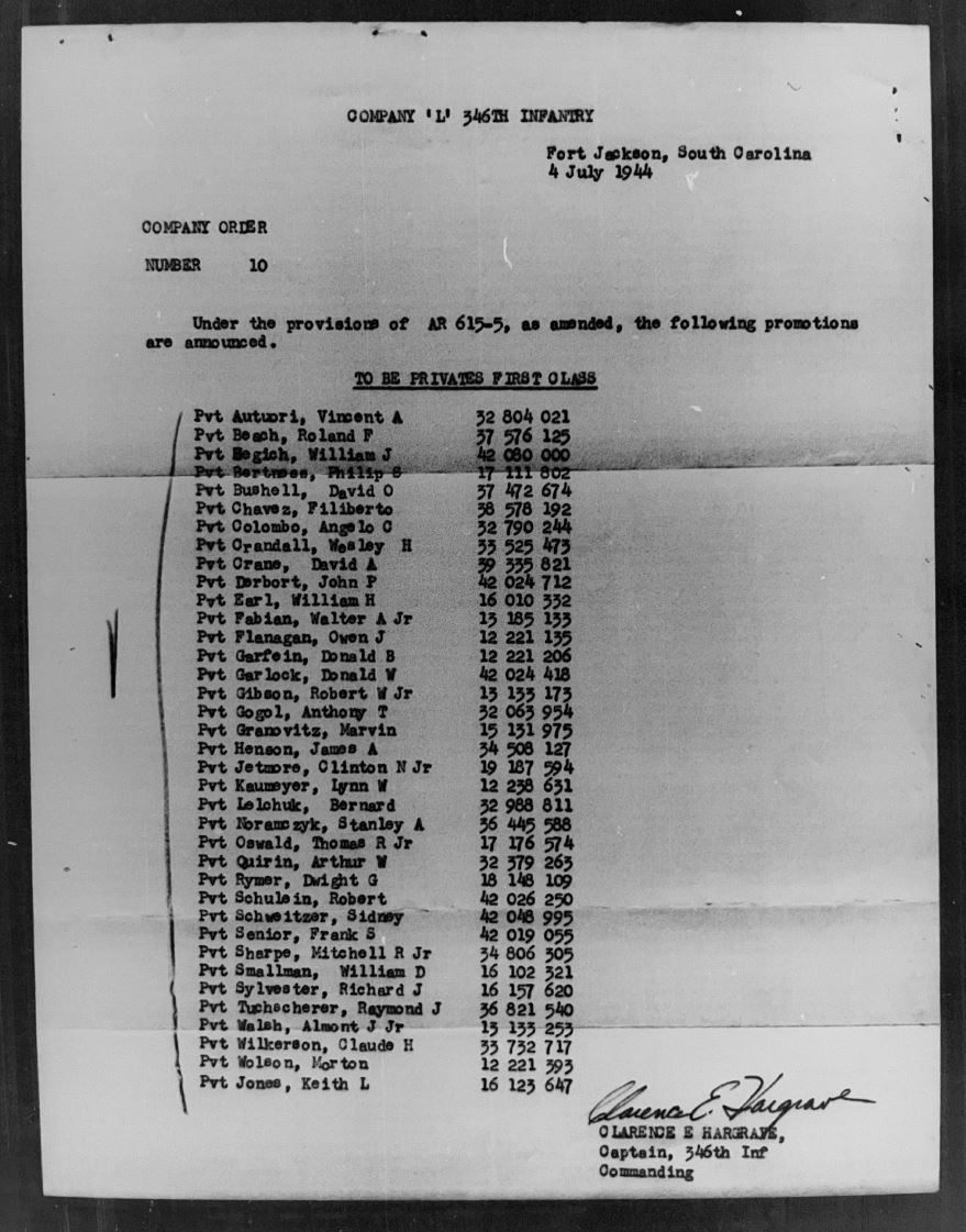 Morning Reports for Company “L,” 346th Infantry Regiment. March 1944. U.S. Army Morning Reports, c. 1912–1946. Record Group 64, Records of the National Archives and Records Administration. National Archives at St. Louis, Missouri. https://s3.amazonaws.com/NARAprodstorage/lz/partners/st-louis/rg-064/85713825-wwii/85713825_1944-03/85713825_1944-03_Roll-0381/85713825_1944-03_Roll-0381-12.pdf