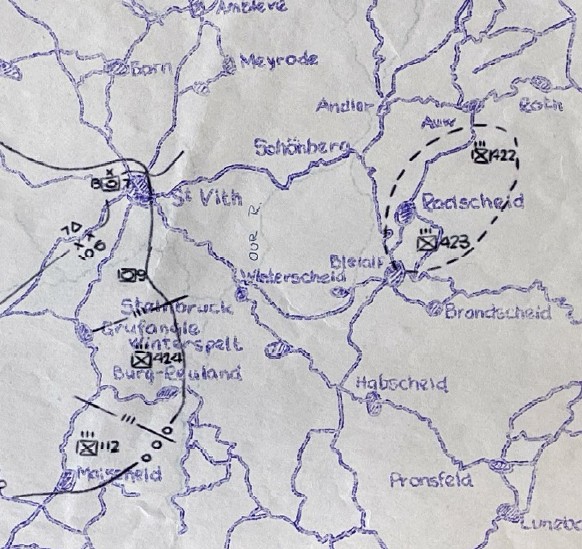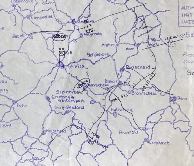 Those roads converged behind them to the west, meaning that if the enemy broke through traveling those roads, both regiments would quickly face encirclement. The road passing through Bleialf, Germany, on the American right was garrisoned only by Antitank Company, 423rd Infantry.