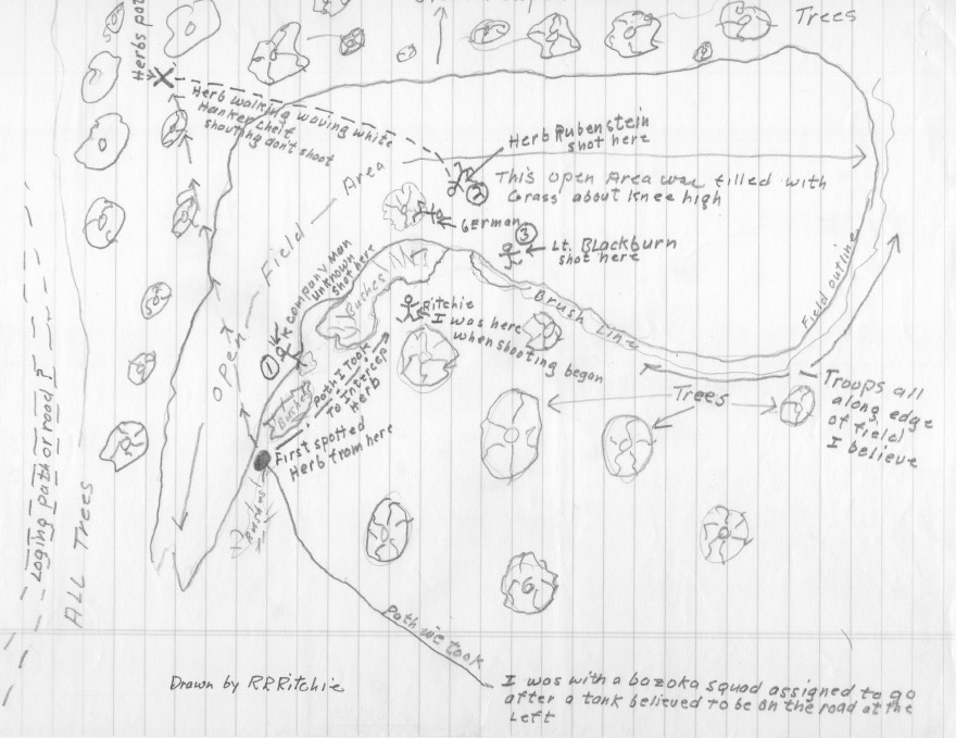 We slowly and quietly worked our way to the edge of an open area. Before proce[e]ding across the open area we studied the situation ahead and spotted someone ahead and to our right. We waited a bit and I said don’t shoot it’s one of ours and he’s a medic. After he progressed a little further we could see he was waving a white object and “yelling [sic] don’t shoot all hell has broken loose up ahead.” At this point I could see it was Herb Rubenstien [sic]. At this point [neither] Herb nor did I or anyone else know what was ahead because of the trees, brush and knee high grass. […] I determined the direction Herb was moving and took a path under cover of bushes and trees in an attempt to intercept Herb. About halfway to the point of intercepting Herb all hell broke out shooting in front of me and both sides. I hit the ground and laid as flat as I could and waited until the shooting stopped.