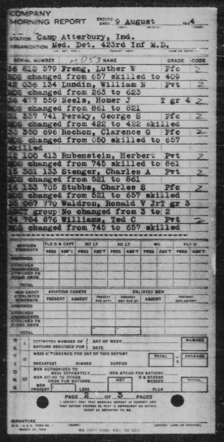 Morning Reports for Medical Detachment, 423rd Infantry Regiment. March 1944 – December 1944. U.S. Army Morning Reports, c. 1912–1946. Record Group 64, Records of the National Archives and Records Administration. National Archives at St. Louis, Missouri. https://s3.amazonaws.com/NARAprodstorage/lz/partners/st-louis/rg-064/85713825-wwii/85713825_1944-03/85713825_1944-03_Roll-0137/85713825_1944-03_Roll-0137-29.pdf, https://s3.amazonaws.com/NARAprodstorage/lz/partners/st-louis/rg-064/85713825-wwii/85713825_1944-04/85713825_1944-04_Roll-0081/85713825_1944-04_Roll-0081-18.pdf, https://s3.amazonaws.com/NARAprodstorage/lz/partners/st-louis/rg-064/85713825-wwii/85713825_1944-05/85713825_1944-05_Roll-0387/85713825_1944-05_Roll-0387-20.pdf, https://s3.amazonaws.com/NARAprodstorage/lz/partners/st-louis/rg-064/85713825-wwii/85713825_1944-05/85713825_1944-05_Roll-0387/85713825_1944-05_Roll-0387-21.pdf, https://s3.amazonaws.com/NARAprodstorage/lz/partners/st-louis/rg-064/85713825-wwii/85713825_1944-06/85713825_1944-06_Roll-0021/85713825_1944-06_Roll-0021-26.pdf, https://s3.amazonaws.com/NARAprodstorage/lz/partners/st-louis/rg-064/85713825-wwii/85713825_1944-07/85713825_1944-07_Roll-0069/85713825_1944-07_Roll-0069-04.pdf, https://s3.amazonaws.com/NARAprodstorage/lz/partners/st-louis/rg-064/85713825-wwii/85713825_1944-07/85713825_1944-07_Roll-0069/85713825_1944-07_Roll-0069-05.pdf, https://s3.amazonaws.com/NARAprodstorage/lz/partners/st-louis/rg-064/85713825-wwii/85713825_1944-08/85713825_1944-08_Roll-0057/85713825_1944-08_Roll-0057-31.pdf, https://s3.amazonaws.com/NARAprodstorage/lz/partners/st-louis/rg-064/85713825-wwii/85713825_1944-08/85713825_1944-08_Roll-0057/85713825_1944-08_Roll-0057-32.pdf, https://s3.amazonaws.com/NARAprodstorage/lz/partners/st-louis/rg-064/85713825-wwii/85713825_1944-09/85713825_1944-09_Roll-0229/85713825_1944-09_Roll-0229-23.pdf, https://s3.amazonaws.com/NARAprodstorage/lz/partners/st-louis/rg-064/85713825-wwii/85713825_1944-09/85713825_1944-09_Roll-0229/85713825_1944-09_Roll-0229-24.pdf, https://s3.amazonaws.com/NARAprodstorage/lz/partners/st-louis/rg-064/85713825-wwii/85713825_1944-10/85713825_1944-10_Roll-0086/85713825_1944-10_Roll-0086-15.pdf, https://s3.amazonaws.com/NARAprodstorage/lz/partners/st-louis/rg-064/85713825-wwii/85713825_1944-11/85713825_1944-11_Roll-0399/85713825_1944-11_Roll-0399-23.pdf, https://s3.amazonaws.com/NARAprodstorage/lz/partners/st-louis/rg-064/85713825-wwii/85713825_1944-12/85713825_1944-12_Roll-0481/85713825_1944-12_Roll-0481-13.pdf