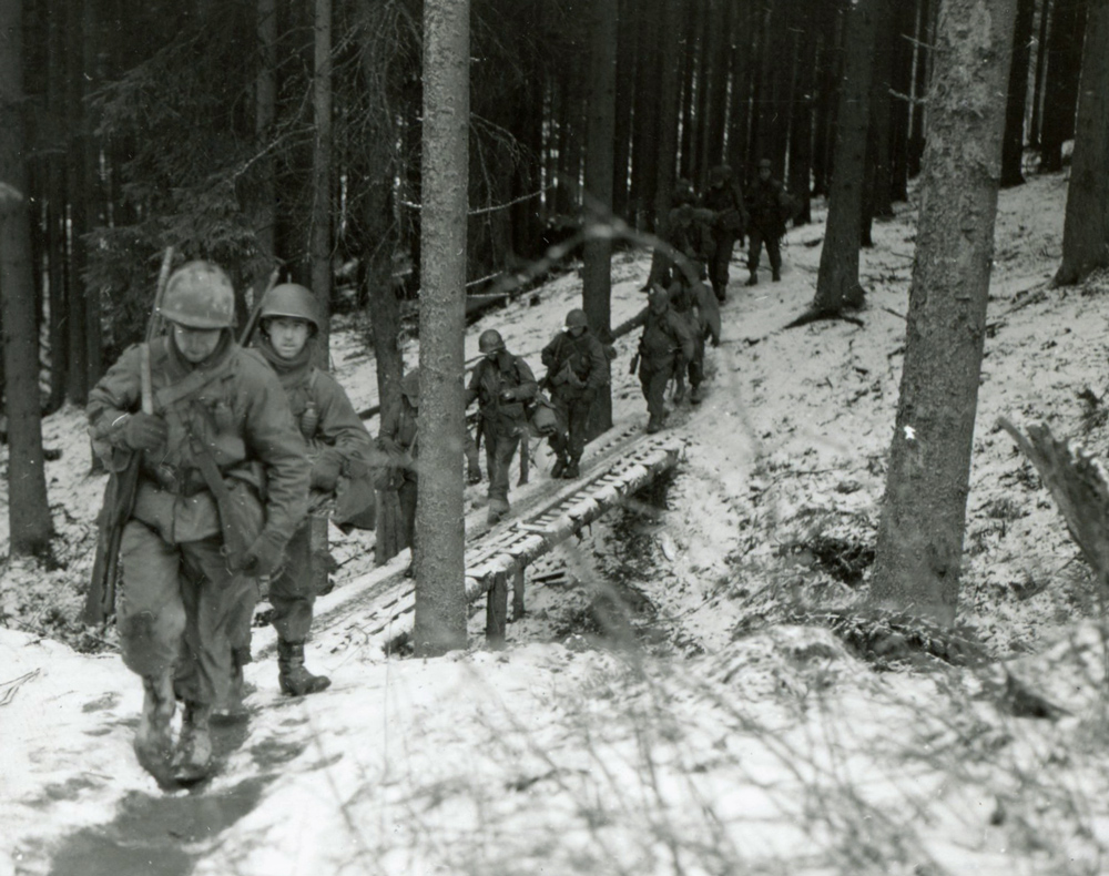 On the morning of December 16, 1944, the Germans launched a massive counteroffensive through the Ardennes that came to be known as the Battle of the Bulge. The opening artillery bombardment disrupted the 423rd Infantry’s communications and destroyed a stockpile of ammunition. The enemy hit Antitank Company, 423rd Infantry, at Bleialf. A scratch force from the 423rd’s Cannon Company and Service Company, supplemented by a small number of combat engineers, tank destroyers, and field artillery, launched a successful counterattack, driving the enemy back.