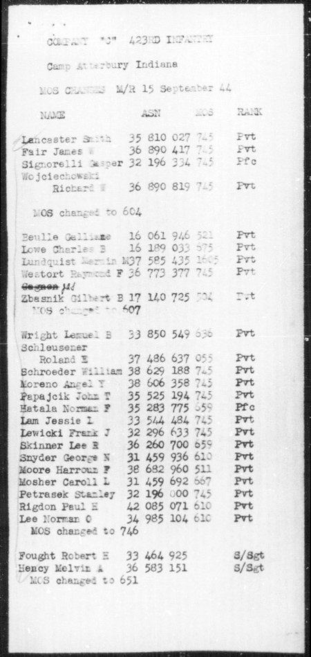 Morning Reports for Company “C” 53rd Infantry Training Battalion. July 1944. U.S. Army Morning Reports, c. 1912–1946. Record Group 64, Records of the National Archives and Records Administration. National Archives at St. Louis, Missouri. https://s3.amazonaws.com/NARAprodstorage/lz/partners/st-louis/rg-064/85713825-wwii/85713825_1944-07/85713825_1944-07_Roll-0384/85713825_1944-07_Roll-0384-03.pdf