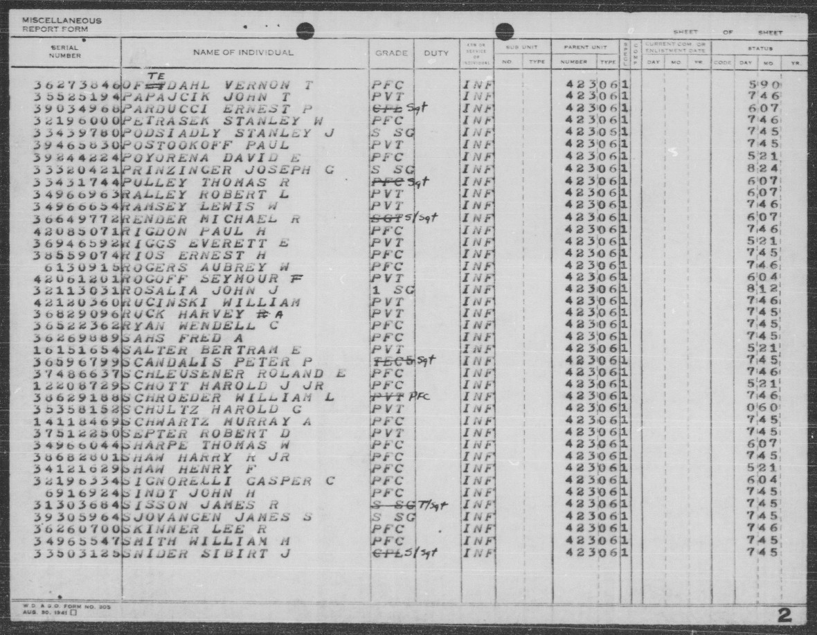 Morning Reports for Company “C,” 423rd Infantry Regiment. September 1944 – December 1944. U.S. Army Morning Reports, c. 1912–1946. Record Group 64, Records of the National Archives and Records Administration. National Archives at St. Louis, Missouri. https://s3.amazonaws.com/NARAprodstorage/lz/partners/st-louis/rg-064/85713825-wwii/85713825_1944-09/85713825_1944-09_Roll-0229/85713825_1944-09_Roll-0229-19.pdf, https://s3.amazonaws.com/NARAprodstorage/lz/partners/st-louis/rg-064/85713825-wwii/85713825_1944-10/85713825_1944-10_Roll-0086/85713825_1944-10_Roll-0086-12.pdf, https://s3.amazonaws.com/NARAprodstorage/lz/partners/st-louis/rg-064/85713825-wwii/85713825_1944-11/85713825_1944-11_Roll-0399/85713825_1944-11_Roll-0399-20.pdf, https://s3.amazonaws.com/NARAprodstorage/lz/partners/st-louis/rg-064/85713825-wwii/85713825_1944-12/85713825_1944-12_Roll-0481/85713825_1944-12_Roll-0481-10.pdf