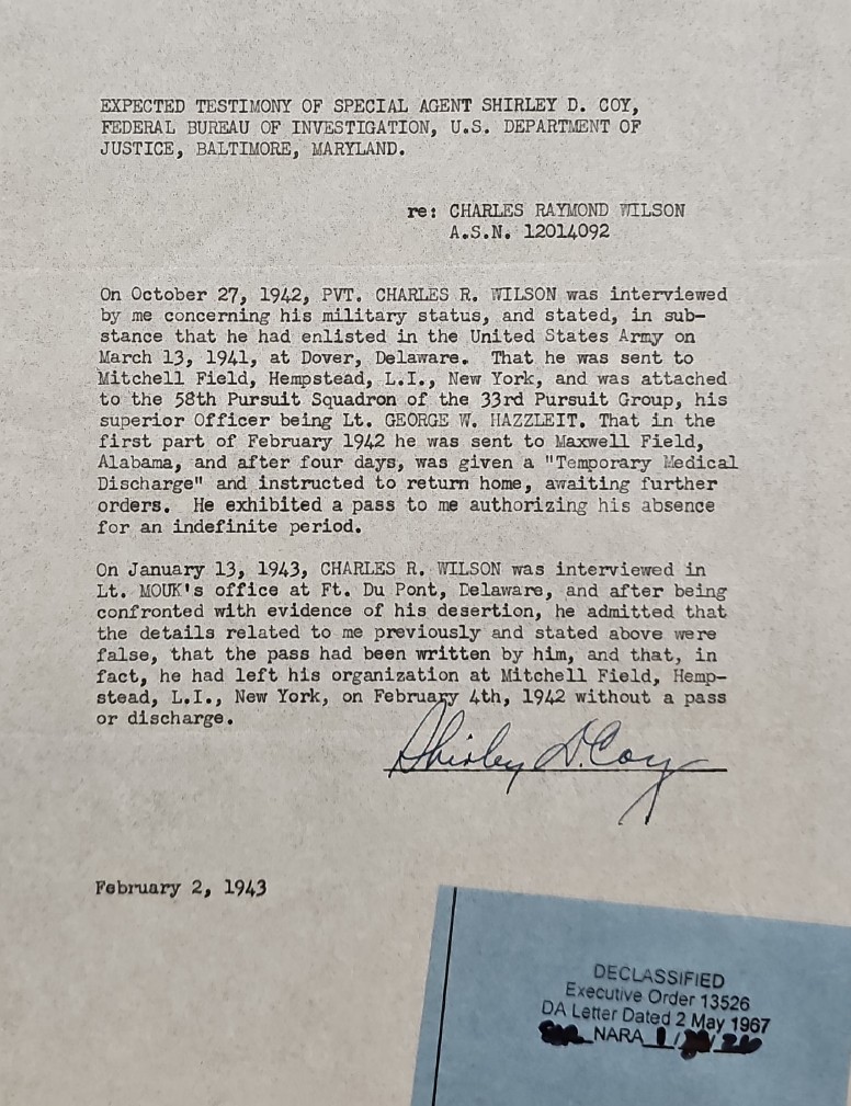 Sometime in 1942, the U.S. attorney for the District of Delaware in Wilmington received a tip that a Charles R. Wilson of Frederica had not registered for the draft. The investigation was eventually turned over to Federal Bureau of Investigation (F.B.I.) Special Agent Shirley “Del” Delbert Coy (1913–1996). Coy called Wilson’s employer to ask Wilson to come in for an interview in Wilmington, which he did on October 27, 1942.