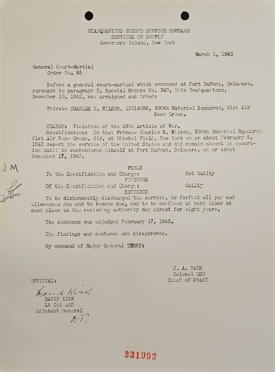 On the evening of February 17, 1943, Private Wilson was tried by general court-martial at Fort DuPont. He pled not guilty to the single charge, violation of the 58th Article of War, desertion during the period of February 5, 1942, through November 17, 1942. He was convicted and sentenced “To be dishonorably discharged [from] the service, to forfeit all pay and allowances due and to be become due, and to be confined at hard labor at such place as the reviewing authority may direct for eight years.” The entire trial had lasted just 75 minutes.