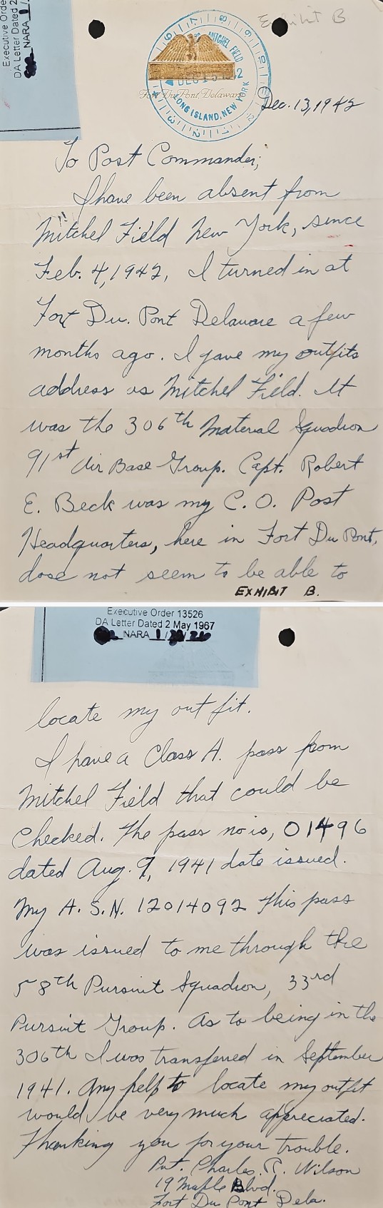 It is doubtful that Private Wilson was a candidate for aviation cadet, given that 306th Materiel Squadron morning reports mention only the detached service at Floyd Bennett Field, but his claim that he was released from active duty for medical reasons was false. Mouk testified that Wilson changed his story, admitting: