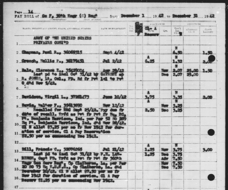 “Pay Roll of Company ‘E’ 360th Engineer General Ser. Regiment For month of December, 1942.” December 31, 1942. U.S. Army Muster Rolls and Rosters, November 1, 1912 – December 31, 1943. Record Group 64, Records of the National Archives and Records Administration. National Archives at St. Louis, Missouri. https://s3.amazonaws.com/NARAprodstorage/lz/st-louis/rg-064/85713803_1940-1943/85713803_1940-1943_Roll-0774/85713803_1940-1943_Roll-0774_15.pdf