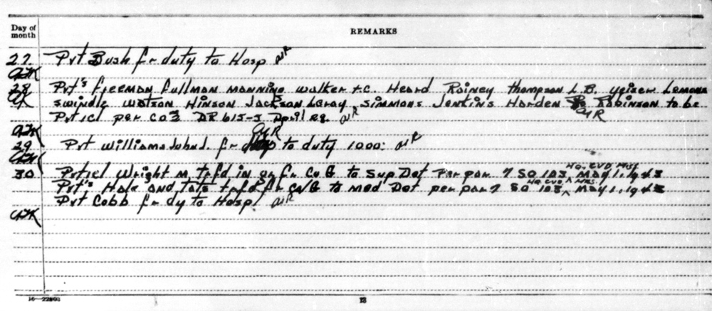 Morning reports indicate that Fullman did not go on furlough after his father died on April 19, 1943. He was promoted to private 1st class on April 28, 1943. His company went into the field again May 23–29, 1943, bivouacking in Homochitto National Forest and Percy Quin State Park, Mississippi.