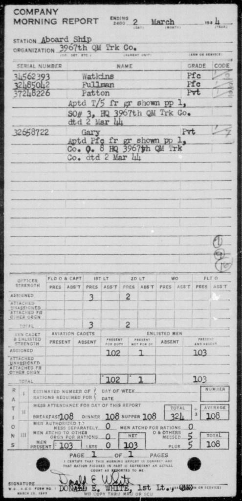 Morning Reports for 3967th Quartermaster Truck Company. December 1943 – March 1944. U.S. Army Morning Reports, c. 1912–1946. Record Group 64, Records of the National Archives and Records Administration. National Archives at St. Louis, Missouri. https://s3.amazonaws.com/NARAprodstorage/lz/partners/st-louis/rg-064/85713825-wwii/85713825_1943-12/85713825_1943-12_Roll-0370/85713825_1943-12_Roll-0370-07.pdf, https://s3.amazonaws.com/NARAprodstorage/lz/partners/st-louis/rg-064/85713825-wwii/85713825_1944-01/85713825_1944-01_Roll-0195/85713825_1944-01_Roll-0195-04.pdf, https://s3.amazonaws.com/NARAprodstorage/lz/partners/st-louis/rg-064/85713825-wwii/85713825_1944-01/85713825_1944-01_Roll-0195/85713825_1944-01_Roll-0195-05.pdf, https://s3.amazonaws.com/NARAprodstorage/lz/partners/st-louis/rg-064/85713825-wwii/85713825_1944-02/85713825_1944-02_Roll-0252/85713825_1944-02_Roll-0252-03.pdf, https://s3.amazonaws.com/NARAprodstorage/lz/partners/st-louis/rg-064/85713825-wwii/85713825_1944-02/85713825_1944-02_Roll-0381/85713825_1944-02_Roll-0381-24.pdf, https://s3.amazonaws.com/NARAprodstorage/lz/partners/st-louis/rg-064/85713825-wwii/85713825_1944-02/85713825_1944-02_Roll-0650/85713825_1944-02_Roll-0650-32.pdf, https://s3.amazonaws.com/NARAprodstorage/lz/partners/st-louis/rg-064/85713825-wwii/85713825_1944-03/85713825_1944-03_Roll-0645/85713825_1944-03_Roll-0645-24.pdf, https://s3.amazonaws.com/NARAprodstorage/lz/partners/st-louis/rg-064/85713825-wwii/85713825_1944-03/85713825_1944-03_Roll-0645/85713825_1944-03_Roll-0645-25.pdf