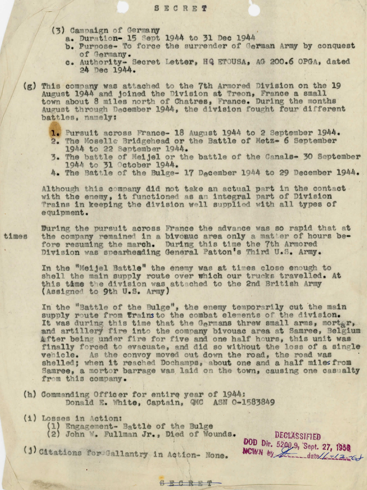 In the “Battle of the Bulge”, the enemy temporarily cut the main supply route from Trains to the combat elements of the division. It was during this time that the Germans threw small arms, mortar, and artillery fire into the company bivouac area at Samree, Belgium[.] After being under fire for five and one half hours, this unit was finally forced to evacuate, and did so without the loss of a single vehicle. As the convoy moved out down the road, the road was shelled; when it reached Dochamps, about one and a half miles from Samree, a mort[a]r barrage was laid on the town, causing one casualty from this company.