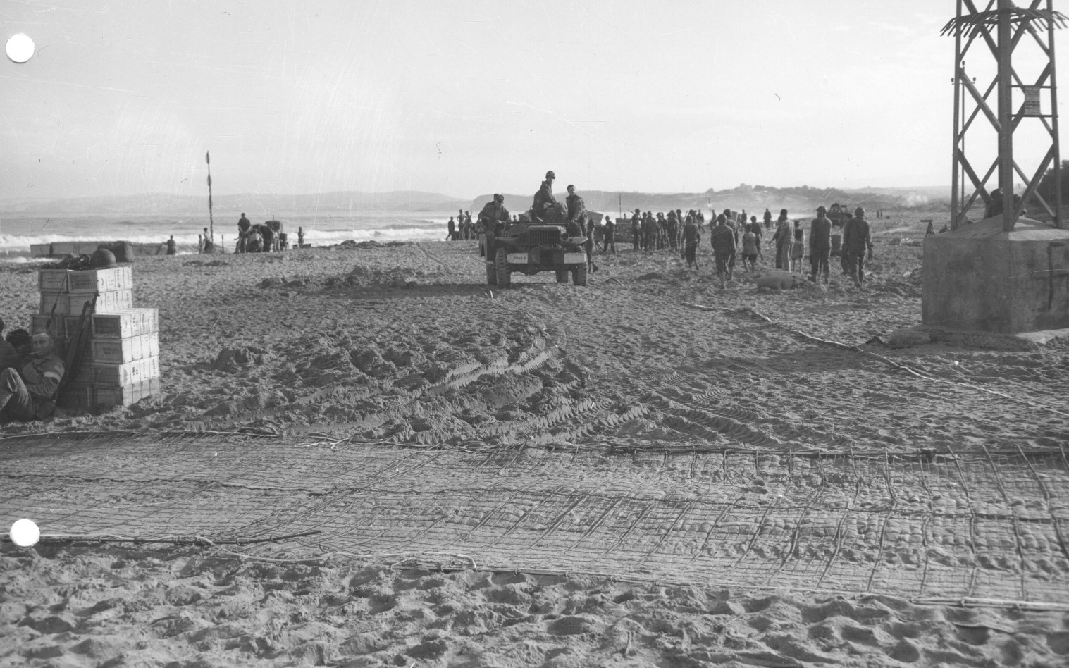 Despite the inexperience of both Army and Navy personnel, the 531st’s role in the invasion went relatively smoothly. Colonel Brown observed: “Beach conditions were excellent. Exits were easily prepared. Sommerfeld mat was extensively used on dry sand with and without burlap revetment. Trucks could operate over saturated sand without road mats.” There were roads and even railroad tracks just inland, though little rolling stock was available.