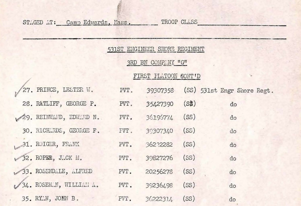Most passenger manifests associated with the U.S. Army’s massive overseas buildup were disposed of after the war. However, manifests from the period in which the 531st Engineers were staging at Camp Edwards ended up preserved in a collection of general correspondence at the National Archives. It lists Private Rosendale as a member of 1st Platoon, Company “G.” At the time, the company had a headquarters platoon and three numbered platoons.