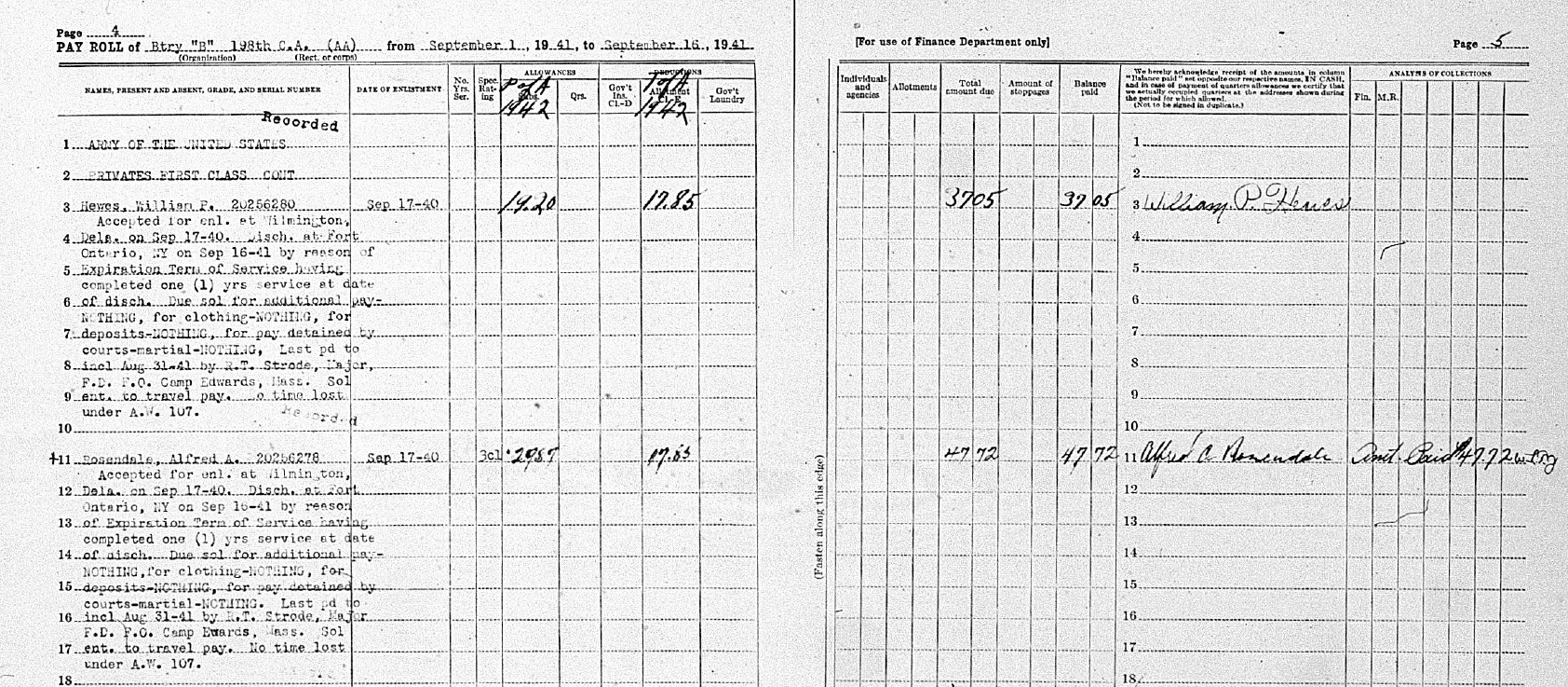“Discharge Pay Roll of Battery ‘B’ 198th Coast Artillery For month of September 1–16, 1941.” September 16, 1941. Individual Pay Vouchers, c. 1926–1963. Record Group 64, Records of the National Archives and Records Administration. National Archives at St. Louis, Missouri.