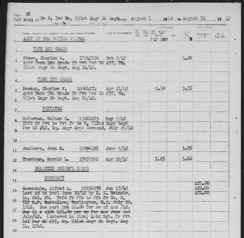 “Pay Roll of Company ‘G’, 3rd Battalion, 531st Engr. Shore. Regt.” August 31, 1942. U.S. Army Muster Rolls and Rosters, November 1, 1912 – December 31, 1943. Record Group 64, Records of the National Archives and Records Administration. National Archives at St. Louis, Missouri. https://s3.amazonaws.com/NARAprodstorage/lz/st-louis/rg-064/85713803_1940-1943/85713803_1940-1943_Roll-0791/85713803_1940-1943_Roll-0791_03.pdf