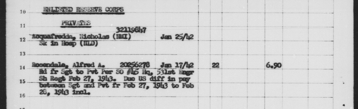 At 1400 hours on January 31, 1943, Sergeant Rosendale was hospitalized at the 180th Station Hospital for an unspecified illness, not in the line of duty. He rejoined his company at 1300 hours on February 11 at Relizane, Algeria, where his unit was working on an airfield runway. He was reduced to the grade of private on February 27.