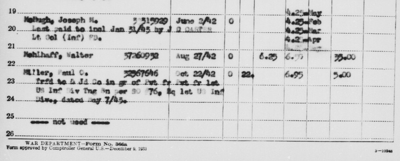 “Pay Roll of Company ‘A’ Sixteenth Infantry For month of May, 1943.” May 31, 1943. U.S. Army Muster Rolls and Rosters, November 1, 1912 – December 31, 1943. Record Group 64, Records of the National Archives and Records Administration. National Archives at St. Louis, Missouri. https://s3.amazonaws.com/NARAprodstorage/lz/st-louis/rg-064/85713803_1940-1943/85713803_1940-1943_Roll-1501/85713803_1940-1943_Roll-1501_12.pdf, https://s3.amazonaws.com/NARAprodstorage/lz/st-louis/rg-064/85713803_1940-1943/85713803_1940-1943_Roll-1501/85713803_1940-1943_Roll-1501_13.pdf